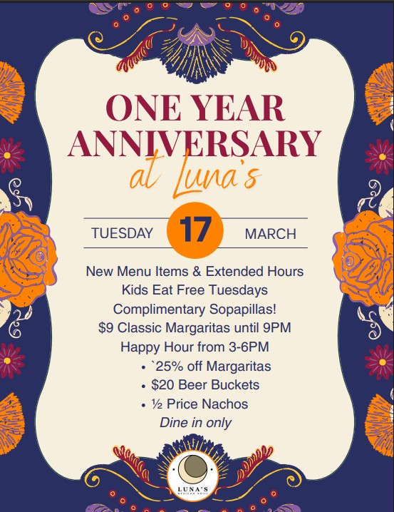 Luna's 1 Year Anniversary on St. Patrick's Day! come and enjoy Taco Tequila Tuesday! and lots of great food specials, new hours and St. Patrick's drinks.